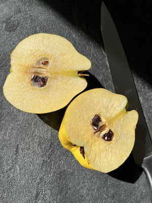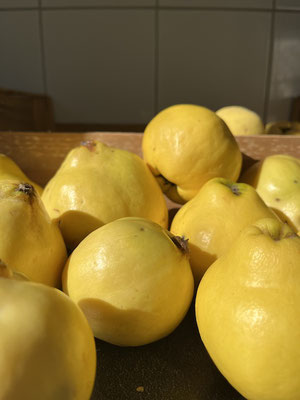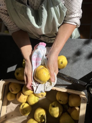 Entre la recherche de coings sauvages (qui sont de plus en plus rares), le lustrage de chaque fruit (c'est à dire enlever le petit duvet), la découpe (qui fait les muscles) et la cuisson (ni pas assez ni trop), cette gelée se mérite !